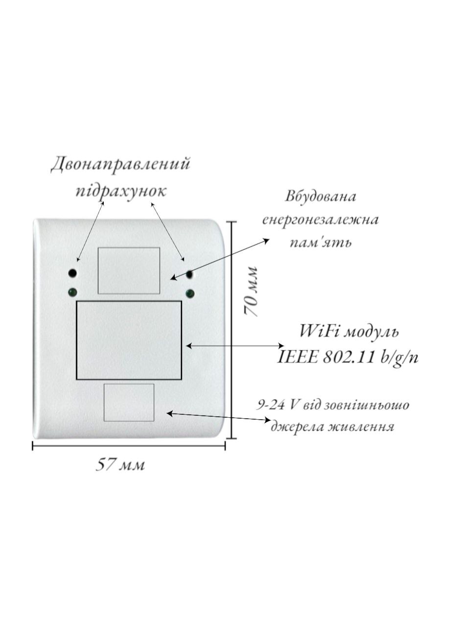 Тип: інфрачервоний, горизонтальний Напрямок підрахунку: двонаправлений Відстань між сенсорами: 1-10 метрів Налаштквання параметрів роботи:Web, Android app Час автономного зберігання статистики: до 6 місіців Тип живлення : зовнішнє джерело живлення Напруга живлення: від 9В до 12В постійного струму Передача даних на сервер: WiFi Wi-Fi стандарт: IEEE 802.11 b/g/n Тип антени: вбудована Захист від тривалого перекриття: звуковий сигнал Колів: білий Розмір: 57х70х25 мм